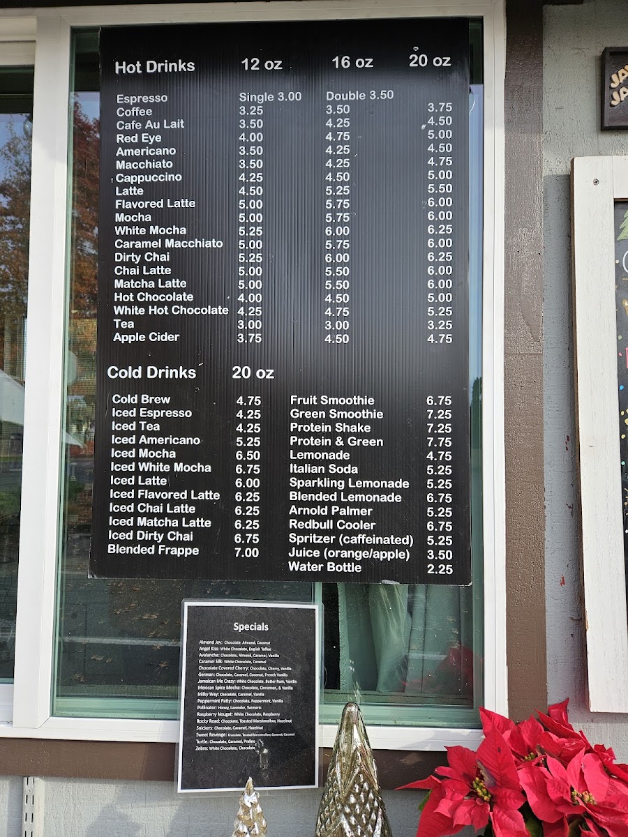 Specials include a variety of creatively named coffee drinks with diverse flavor profiles, ranging from nutty and chocolate-inspired options like Almond Joy and Chocolate Covered Cherry, to spicy and rich choices such as Mexican Spice Mocha and Jamaican Me Crazy, as well as other flavors like Caramel Silk, Peppermint Patty, and Rocky Road.